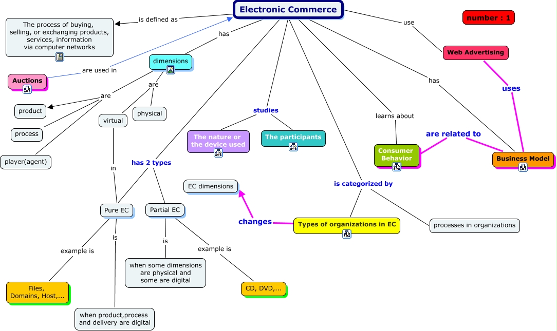 This Concept Map, created with IHMC CmapTools, has information related to: Map of Maps, Pure EC example is Files, Domains, Host,..., dimensions are product, dimensions are process, dimensions are physical, Auctions are used in Electronic Commerce, Electronic Commerce use Web Advertising, Partial EC example is CD, DVD,..., Electronic Commerce is categorized by processes in organizations, Electronic Commerce learns about Consumer Behavior, Electronic Commerce has Business Model, dimensions are player(agent), Web Advertising uses Business Model, Electronic Commerce has 2 types Pure EC, Business Model are related to Consumer Behavior, Electronic Commerce studies The nature or the device used, Electronic Commerce is defined as The process of buying, selling, or exchanging products, services, information via computer networks, Electronic Commerce has dimensions, virtual in Pure EC, Types of organizations in EC changes EC dimensions, Electronic Commerce is categorized by Types of organizations in EC