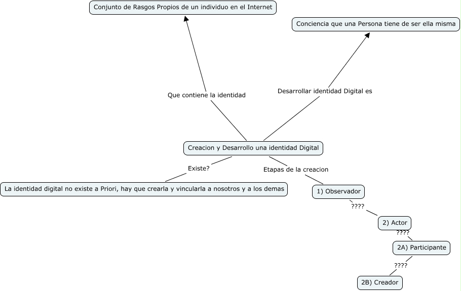 Este Cmap, tiene información relacionada con: E-aprendiz Creacion, Creacion y Desarrollo una identidad Digital Etapas de la creacion 1) Observador, Creacion y Desarrollo una identidad Digital Existe? La identidad digital no existe a Priori, hay que crearla y vincularla a nosotros y a los demas, 2) Actor ???? 2A) Participante, 1) Observador ???? 2) Actor, Creacion y Desarrollo una identidad Digital Que contiene la identidad Conjunto de Rasgos Propios de un individuo en el Internet, Creacion y Desarrollo una identidad Digital Desarrollar identidad Digital es Conciencia que una Persona tiene de ser ella misma, 2A) Participante ???? 2B) Creador
