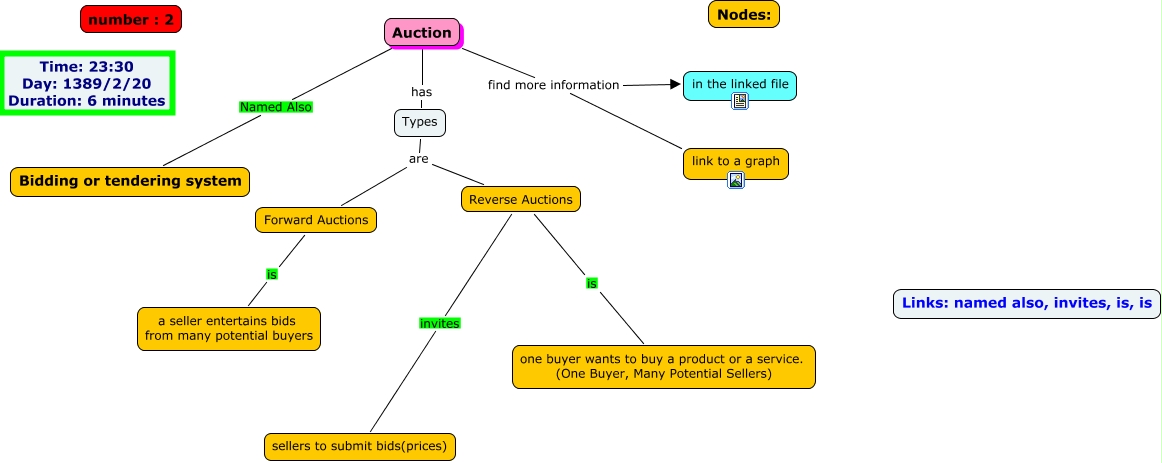 This Concept Map, created with IHMC CmapTools, has information related to: Auction, Reverse Auctions invites sellers to submit bids(prices), Auction has Types, Auction find more information link to a graph, Auction Named Also Bidding or tendering system, Types are Reverse Auctions, Types are Forward Auctions, Reverse Auctions is one buyer wants to buy a product or a service. (One Buyer, Many Potential Sellers), Forward Auctions is a seller entertains bids from many potential buyers, Auction find more information in the linked file