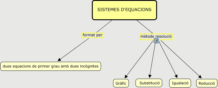 Este Cmap, tiene información relacionada con: Presentació1, SISTEMES D'EQUACIONS format per dues equacions de primer grau amb dues incògnites, SISTEMES D'EQUACIONS mètode resolució Substitució, SISTEMES D'EQUACIONS mètode resolució Igualació, SISTEMES D'EQUACIONS mètode resolució Gràfic, SISTEMES D'EQUACIONS mètode resolució Reducció