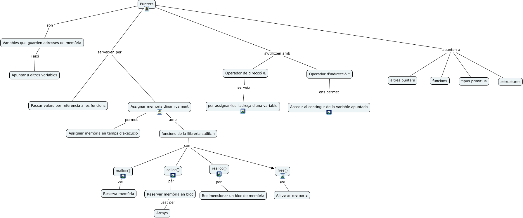 Este Cmap, tiene información relacionada con: punters_presentacio, Punters apunten a altres punters, free() per Alliberar memòria, Reservar memòria en bloc usat per Arrays, funcions de la llibreria stdlib.h com realloc(), Punters apunten a estructures, Operador d'indirecció * ens permet Accedir al contingut de la variable apuntada, funcions de la llibreria stdlib.h com malloc(), Punters serveixen per Passar valors per referència a les funcions, Operador de direcció & serveix per assignar-los l'adreça d'una variable, Assignar memòria dinàmicament amb funcions de la llibreria stdlib.h, calloc() per Reservar memòria en bloc, Punters s'utilitzen amb Operador d'indirecció *, funcions de la llibreria stdlib.h com calloc(), Punters són Variables que guarden adresses de memòria, Punters serveixen per Assignar memòria dinàmicament, funcions de la llibreria stdlib.h com free(), Punters s'utilitzen amb Operador de direcció &, malloc() per Reserva memòria, Assignar memòria dinàmicament permet Assignar memòria en temps d'execució, realloc() per Redimensionar un bloc de memòria
