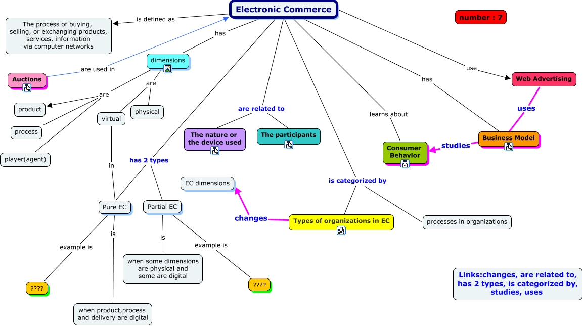 This Concept Map, created with IHMC CmapTools, has information related to: Map of Maps, dimensions are product, Pure EC example is ????, dimensions are physical, dimensions are process, Electronic Commerce use Web Advertising, Auctions are used in Electronic Commerce, Electronic Commerce is categorized by processes in organizations, Partial EC example is ????, Electronic Commerce learns about Consumer Behavior, dimensions are player(agent), Electronic Commerce has Business Model, Web Advertising uses Business Model, Electronic Commerce has 2 types Pure EC, virtual in Pure EC, Electronic Commerce has dimensions, Electronic Commerce is defined as The process of buying, selling, or exchanging products, services, information via computer networks, Electronic Commerce are related to The nature or the device used, Business Model studies Consumer Behavior, Types of organizations in EC changes EC dimensions, dimensions are virtual