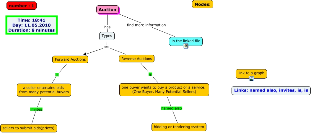 This Concept Map, created with IHMC CmapTools, has information related to: Auction - M.Sadri.cmap, Reverse Auctions is one buyer wants to buy a product or a service. (One Buyer, Many Potential Sellers), Auction has Types, one buyer wants to buy a product or a service. (One Buyer, Many Potential Sellers) named also bidding or tendering system, Types are Reverse Auctions, a seller entertains bids from many potential buyers invites sellers to submit bids(prices), Types are Forward Auctions, Auction find more information in the linked file, Forward Auctions is a seller entertains bids from many potential buyers