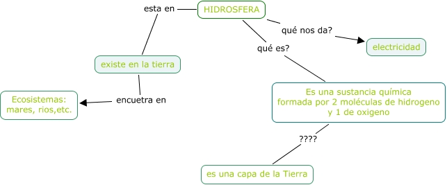 Este Cmap, tiene información relacionada con: Nadia, HIDROSFERA esta en existe en la tierra, HIDROSFERA qué es? Es una sustancia química formada por 2 moléculas de hidrogeno y 1 de oxigeno, Es una sustancia química formada por 2 moléculas de hidrogeno y 1 de oxigeno ???? es una capa de la Tierra, existe en la tierra encuetra en Ecosistemas: mares, rios,etc., HIDROSFERA qué nos da? electricidad