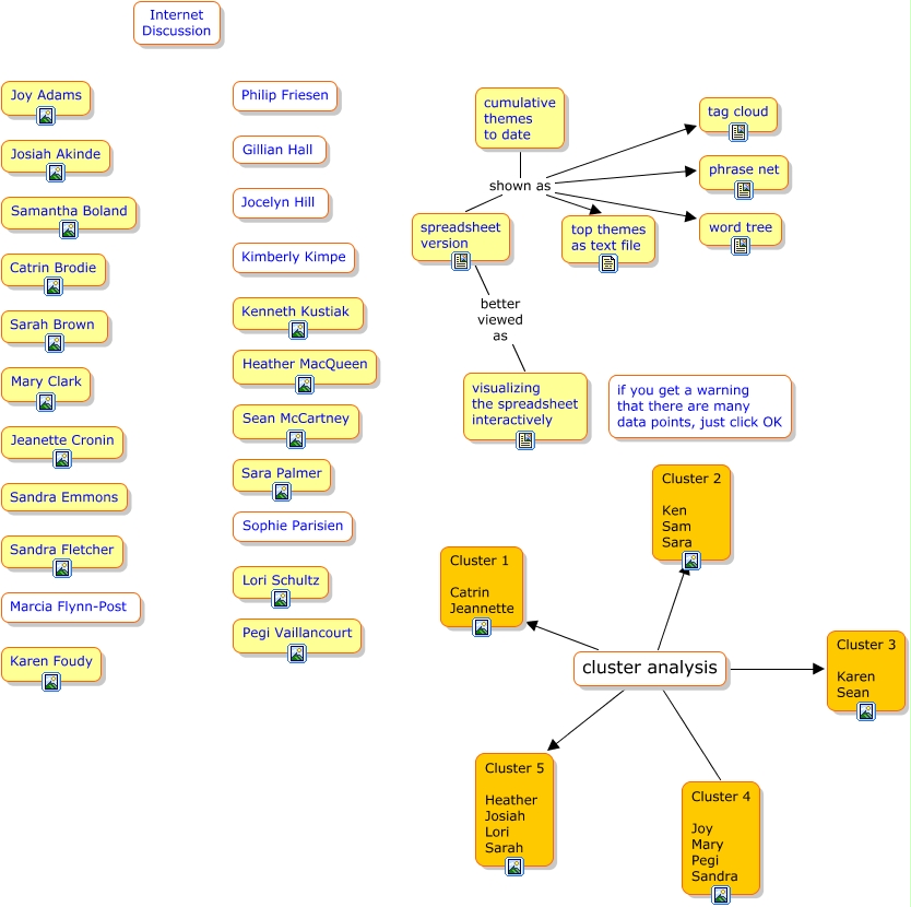 This Concept Map, created with IHMC CmapTools, has information related to: week 2, cumulative themes to date shown as top themes as text file, cluster analysis Cluster 1 Catrin Jeannette, spreadsheet version better viewed as visualizing the spreadsheet interactively, cumulative themes to date shown as spreadsheet version, cumulative themes to date shown as tag cloud, cumulative themes to date shown as word tree, cumulative themes to date shown as phrase net, cluster analysis Cluster 5 Heather Josiah Lori Sarah, cluster analysis Cluster 2 Ken Sam Sara, cluster analysis Cluster 4 Joy Mary Pegi Sandra, cluster analysis Cluster 3 Karen Sean