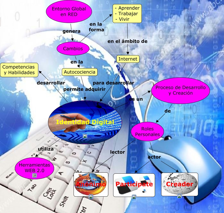 Este Cmap, tiene información relacionada con: Identidad Digital, Roles Personales actor Creador, Roles Personales actor Participate, Identidad Digital utiliza Herramientas WEB 2.0, Cambios en la forma - Aprender - Trabajar - Vivir, Entorno Global en RED genera Cambios, Internet para desarrollar Identidad Digital, Identidad Digital desarrollar Competencias y Habilidades, Autocociencia permite adquirir Identidad Digital, Identidad Digital es un Proceso de Desarrollo y Creación, - Aprender - Trabajar - Vivir en el ámbito de Internet, Proceso de Desarrollo y Creación de Roles Personales, Cambios en la Autocociencia, Roles Personales lector Anónimo