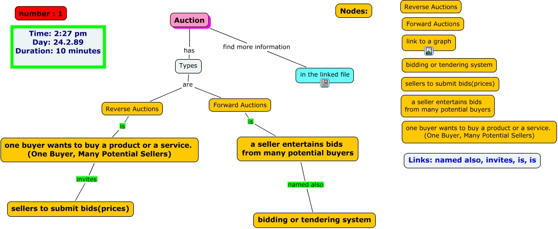 This Concept Map, created with IHMC CmapTools, has information related to: Auction-m.dibay, one buyer wants to buy a product or a service. (One Buyer, Many Potential Sellers) invites sellers to submit bids(prices), a seller entertains bids from many potential buyers named also bidding or tendering system, Auction has Types, Types are Forward Auctions, Types are Reverse Auctions, Forward Auctions is a seller entertains bids from many potential buyers, Reverse Auctions is one buyer wants to buy a product or a service. (One Buyer, Many Potential Sellers), Auction find more information in the linked file