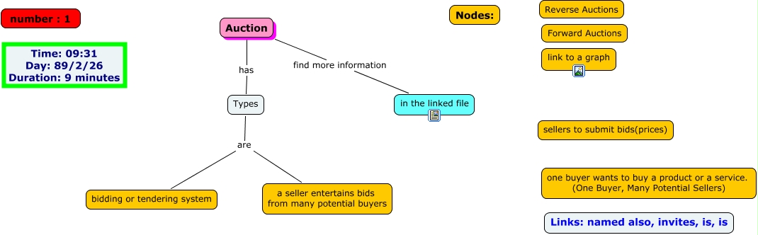 This Concept Map, created with IHMC CmapTools, has information related to: Auction, Auction has Types, Types are a seller entertains bids from many potential buyers, Types are bidding or tendering system, Auction find more information in the linked file