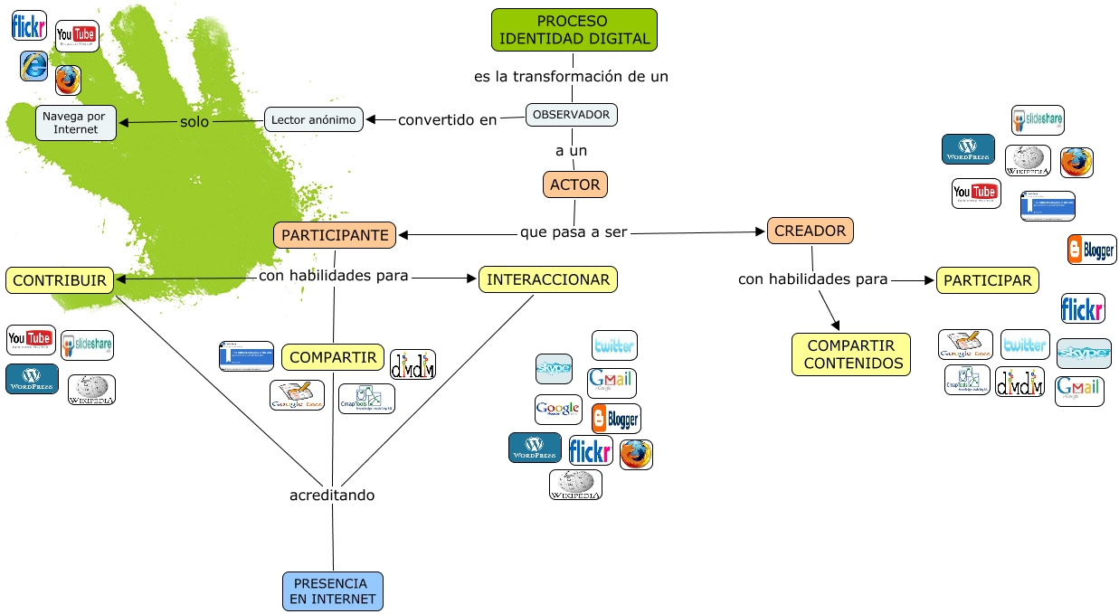 Este Cmap, tiene información relacionada con: Identidad_Digital_smendoza, PROCESO IDENTIDAD DIGITAL es la transformación de un OBSERVADOR, PRESENCIA EN INTERNET acreditando COMPARTIR, CREADOR con habilidades para PARTICIPAR, OBSERVADOR convertido en Lector anónimo, ACTOR que pasa a ser CREADOR, PRESENCIA EN INTERNET acreditando INTERACCIONAR, PARTICIPANTE con habilidades para COMPARTIR, PARTICIPANTE con habilidades para CONTRIBUIR, PRESENCIA EN INTERNET acreditando CONTRIBUIR, OBSERVADOR a un ACTOR, Lector anónimo solo Navega por Internet, PARTICIPANTE con habilidades para INTERACCIONAR, CREADOR con habilidades para COMPARTIR CONTENIDOS, ACTOR que pasa a ser PARTICIPANTE