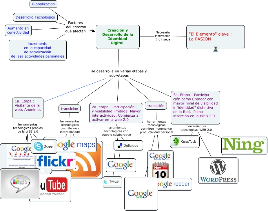 Este Cmap, tiene información relacionada con: JFelix_identidad_digital_v1, 3a. Etapa : Participa- ción como Creador con mayor nivel de visibilidad e "identidad" distintiva en la Red. Plena inserción en la WEB 2.0 herramientas tecnologicas WEB 2.0, 2a. etapa - Participación y visibilidad limitada. Mayor interactividad. Comienza a activar en la web 2.0 herramientas tecnológicas con trabajo colaborativo, transición herramientas tecnológicas permite mas interactividad, 3a. Etapa : Participa- ción como Creador con mayor nivel de visibilidad e "identidad" distintiva en la Red. Plena inserción en la WEB 2.0 herramientas tecnologicas WEB 2.0, transición herramientas tecnológicas permiten incrementar productividad personal, Desarrollo Tecnológico Factores del entorno que afectan Globalizacion, 1a. Etapa : Visitante de la web. Anónimo. herramientas tecnológicas propias de la WEB 1.0, 1a. Etapa : Visitante de la web. Anónimo. herramientas tecnológicas propias de la WEB 1.0, 2a. etapa - Participación y visibilidad limitada. Mayor interactividad. Comienza a activar en la web 2.0 herramientas tecnológicas con trabajo colaborativo, 3a. Etapa : Participa- ción como Creador con mayor nivel de visibilidad e "identidad" distintiva en la Red. Plena inserción en la WEB 2.0 herramientas tecnologicas WEB 2.0, 1a. Etapa : Visitante de la web. Anónimo. herramientas tecnológicas propias de la WEB 1.0, Desarrollo Tecnológico Factores del entorno que afectan Aumento en conectividad, Desarrollo Tecnológico Factores del entorno que afectan incremento en la capacidad de socialización de lasa actividades personales, Creación y Desarrollo de la Identidad Digital Necesaria Motivacion Intrinseca "El Elemento" clave : La PASION, Creación y Desarrollo de la Identidad Digital se desarrolla en varias etapas y sub-etapas 2a. etapa - Participación y visibilidad limitada. Mayor interactividad. Comienza a activar en la web 2.0, Desarrollo Tecnológico Factores del entorno que afectan Creación y Desarrollo de la Identidad Digital, 2a. etapa - Participación y visibilidad limitada. Mayor interactividad. Comienza a activar en la web 2.0 herramientas tecnológicas con trabajo colaborativo, 1a. Etapa : Visitante de la web. Anónimo. herramientas tecnológicas propias de la WEB 1.0, transición herramientas tecnológicas permiten incrementar productividad personal, Creación y Desarrollo de la Identidad Digital se desarrolla en varias etapas y sub-etapas 1a. Etapa : Visitante de la web. Anónimo.