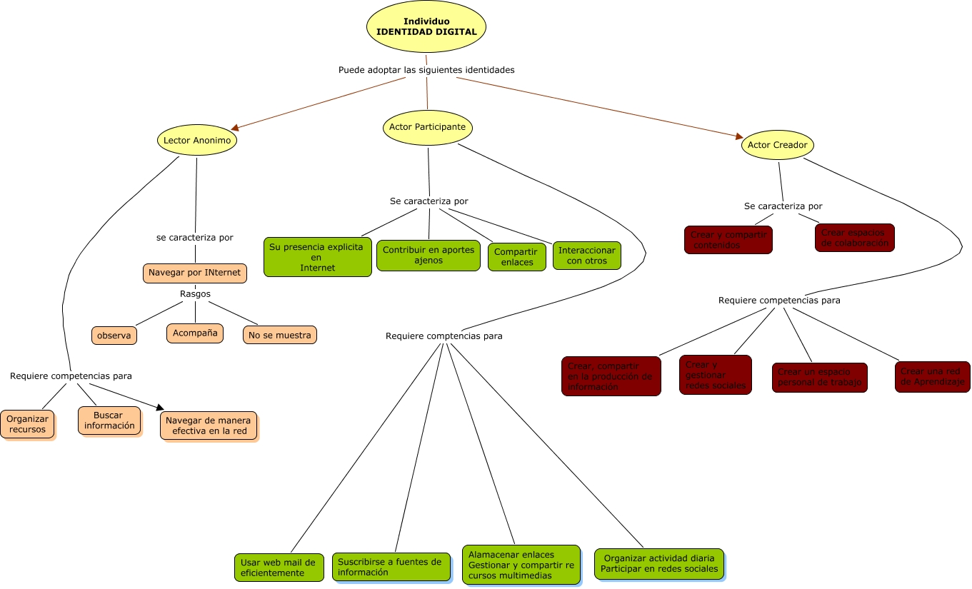 Este Cmap, tiene información relacionada con: Sin Título 1, Actor Participante Requiere comptencias para Usar web mail de eficientemente, Actor Participante Se caracteriza por Su presencia explicita en Internet, Lector Anonimo se caracteriza por Navegar por INternet, Actor Creador Requiere competencias para Crear y gestionar redes sociales, Actor Participante Se caracteriza por Compartir enlaces, Actor Participante Requiere comptencias para Alamacenar enlaces Gestionar y compartir re cursos multimedias, Individuo IDENTIDAD DIGITAL Puede adoptar las siguientes identidades Actor Participante, Actor Creador Requiere competencias para Crear una red de Aprendizaje, Navegar por INternet Rasgos observa, Actor Creador Se caracteriza por Crear espacios de colaboración, Individuo IDENTIDAD DIGITAL Puede adoptar las siguientes identidades Actor Creador, Actor Creador Se caracteriza por Crear y compartir contenidos, Actor Participante Se caracteriza por Interaccionar con otros, Actor Participante Requiere comptencias para Suscribirse a fuentes de información, Actor Creador Requiere competencias para Crear, compartir en la producción de información, Lector Anonimo Requiere competencias para Organizar recursos, Actor Participante Requiere comptencias para Organizar actividad diaria Participar en redes sociales, Navegar por INternet Rasgos Acompaña, Lector Anonimo Requiere competencias para Buscar información, Actor Participante Se caracteriza por Contribuir en aportes ajenos