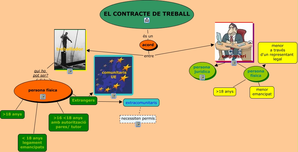 Aquest mapa conceptual conté informació relacionada amb: Presentacio_contracte_treball, acord entre treballador, treballador qui ho pot ser? persona física, persona física menor a través d'un representant legal, empresari 2 tipus persona jurídica, treballador qui ho pot ser? Extrangers, treballador qui ho pot ser? ᡊ anys, acord entre empresari, persona física ᡊ anys, empresari 2 tipus persona física, treballador qui ho pot ser? < 18 anys legament emancipats, treballador qui ho pot ser? ᡈ គ anys amb autorització pares/ tutor, EL CONTRACTE DE TREBALL és un acord, Extrangers extracomunitaris, persona física menor emancipat, extracomunitaris necessiten permís, Extrangers comunitaris UE