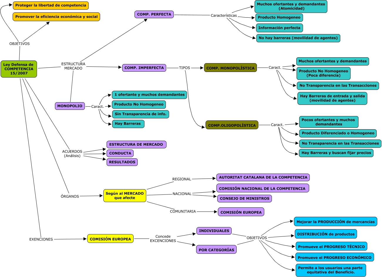 Este Cmap, tiene información relacionada con: Cmap 5 y 6 (Competencia), COMP. IMPERFECTA TIPOS COMP. MONOPOLÍSTICA, Ley Defensa de COMPETENCIA 15/2007 ACUERDOS (Análisis) ESTRUCTURA DE MERCADO, Ley Defensa de COMPETENCIA 15/2007 ESTRUCTURA MERCADO MONOPOLIO, Ley Defensa de COMPETENCIA 15/2007 OBJETIVOS Promover la eficiencia económica y social, INDIVIDUALES OBJETIVOS Promueve el PROGRESO ECONÓMICO, Ley Defensa de COMPETENCIA 15/2007 ACUERDOS (Análisis) RESULTADOS, COMP. PERFECTA Características Muchos ofertantes y demandantes (Atomicidad), COMP. IMPERFECTA TIPOS COMP.OLIGOPOLÍSTICA, COMISIÓN EUROPEA Concede EXCENCIONES INDIVIDUALES, Ley Defensa de COMPETENCIA 15/2007 OBJETIVOS Proteger la libertad de competencia, MONOPOLIO Caract. Hay Barreras, COMP.OLIGOPOLÍSTICA Caract. Pocos ofertantes y muchos demandantes, COMP. MONOPOLÍSTICA Caract. Producto No Homogeneo (Poca diferencia), POR CATEGORÍAS OBJETIVOS Permite a los usuarios una parte equitativa del Beneficio., COMP. PERFECTA Características No hay barreras (movilidad de agentes), MONOPOLIO Caract. Sin Transparencia de info., COMP. MONOPOLÍSTICA Caract. Muchos ofertantes y demandantes, Según al MERCADO que afecte NACIONAL COMISIÓN NACIONAL DE LA COMPETENCIA, COMP.OLIGOPOLÍSTICA Caract. Producto Diferenciado o Homogeneo, MONOPOLIO Caract. Producto No Homogeneo