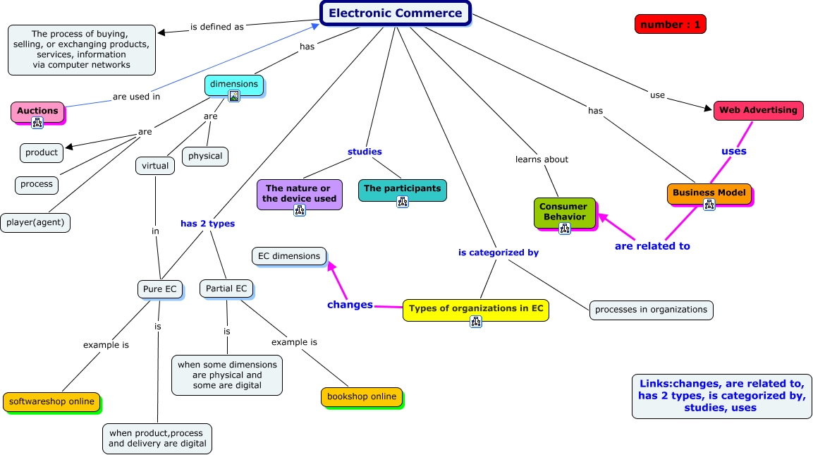 This Concept Map, created with IHMC CmapTools, has information related to: Map of Maps, dimensions are product, Pure EC example is softwareshop online, dimensions are physical, dimensions are process, Electronic Commerce use Web Advertising, Auctions are used in Electronic Commerce, Electronic Commerce is categorized by processes in organizations, Partial EC example is bookshop online, Electronic Commerce learns about Consumer Behavior, dimensions are player(agent), Electronic Commerce has Business Model, Web Advertising uses Business Model, Electronic Commerce has 2 types Pure EC, virtual in Pure EC, Electronic Commerce has dimensions, Electronic Commerce is defined as The process of buying, selling, or exchanging products, services, information via computer networks, Electronic Commerce studies The nature or the device used, Business Model are related to Consumer Behavior, Types of organizations in EC changes EC dimensions, dimensions are virtual