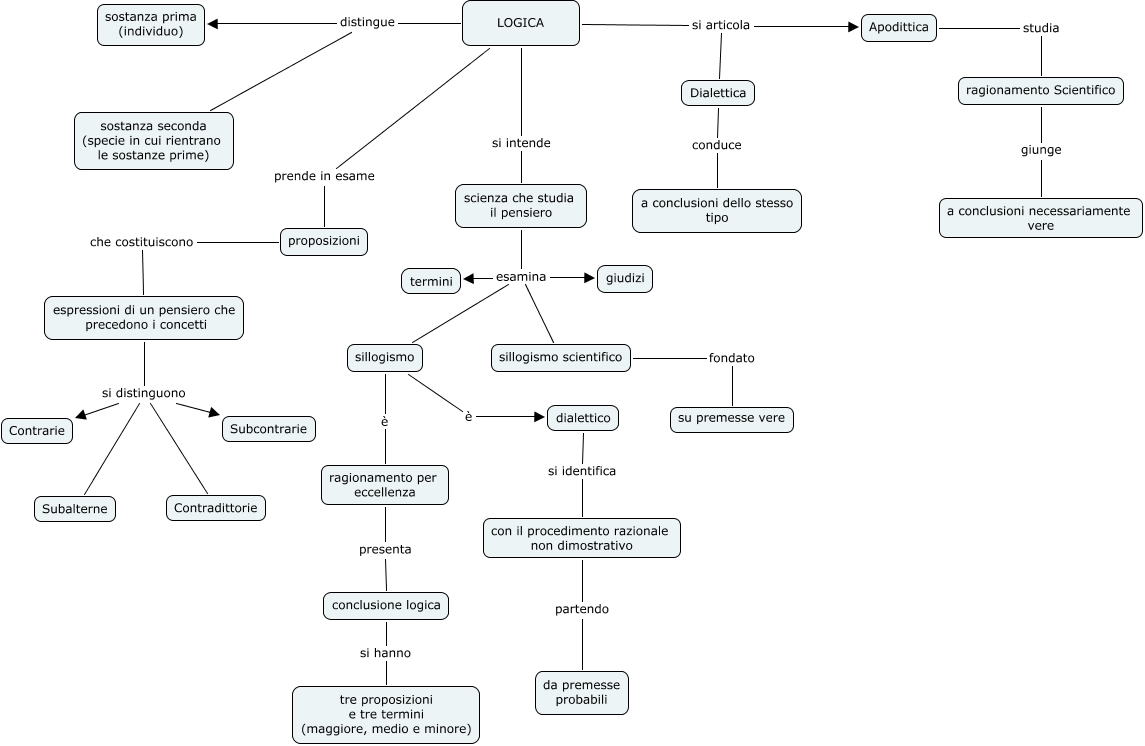 Questa Cmap, creata con IHMC CmapTools, contiene informazioni relative a: Aristotele e logica, Dialettica conduce a conclusioni dello stesso tipo, dialettico si identifica con il procedimento razionale non dimostrativo, LOGICA distingue sostanza prima (individuo), ragionamento per eccellenza presenta conclusione logica, conclusione logica si hanno tre proposizioni e tre termini (maggiore, medio e minore), LOGICA si articola Dialettica, scienza che studia il pensiero esamina sillogismo scientifico, scienza che studia il pensiero esamina sillogismo, espressioni di un pensiero che precedono i concetti si distinguono Subalterne, sillogismo scientifico fondato su premesse vere, scienza che studia il pensiero esamina giudizi, proposizioni che costituiscono espressioni di un pensiero che precedono i concetti, Apodittica studia ragionamento Scientifico, sillogismo è ragionamento per eccellenza, ragionamento Scientifico giunge a conclusioni necessariamente vere, sillogismo è dialettico, con il procedimento razionale non dimostrativo partendo da premesse probabili, LOGICA si intende scienza che studia il pensiero, LOGICA distingue sostanza seconda (specie in cui rientrano le sostanze prime), scienza che studia il pensiero esamina termini