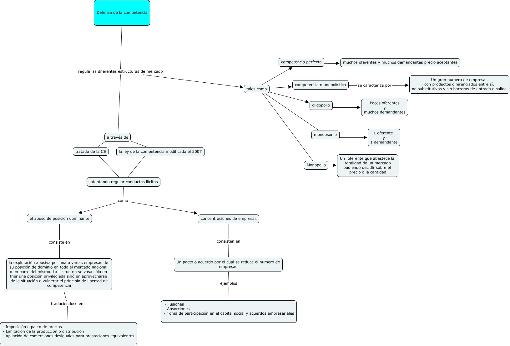 Este Cmap, tiene información relacionada con: caso 5 i 6 cpmpetencia, a través de ???? tratado de la CE, tales como ???? oligopolio, la ley de la competencia modificada el 2007 ???? intentando regular conductas ilícitas, tratado de la CE ???? intentando regular conductas ilícitas, Un pacto o acuerdo por el cual se reduce el numero de empresas ejemplos - Fusiones - Absorciones - Toma de participación en el capital social y acuerdos empresariales, monopsonio ???? 1 oferente y 1 demandante, el abuso de posición dominante consiste en la explotación abusiva por una o varias empresas de su posición de dominio en todo el mercado nacional o en parte del mismo. La ilicitud no se vasa sólo en tner una posición privilegiada sinó en aprovecharse de la situación e vulnerar el principio de libertad de competencia, Defensa de la competencia regula las diferentes estructuras de mercado a través de, Defensa de la competencia regula las diferentes estructuras de mercado tales como, tales como ???? competencia perfecta, concentraciones de empresas consisten en Un pacto o acuerdo por el cual se reduce el numero de empresas, intentando regular conductas ilícitas como concentraciones de empresas, intentando regular conductas ilícitas como el abuso de posición dominante, oligopolio ???? Pocos oferentes y muchos demandantes, tales como ???? Monopolio, competencia monopolística se caracteriza por Un gran número de empresas con productos diferenciados entre sí, no substitutivos y sin barreras de entrada o salida, competencia perfecta ???? muchos oferentes y muchos demandantes precio aceptantes, tales como ???? competencia monopolística, a través de ???? la ley de la competencia modificada el 2007, tales como ???? monopsonio