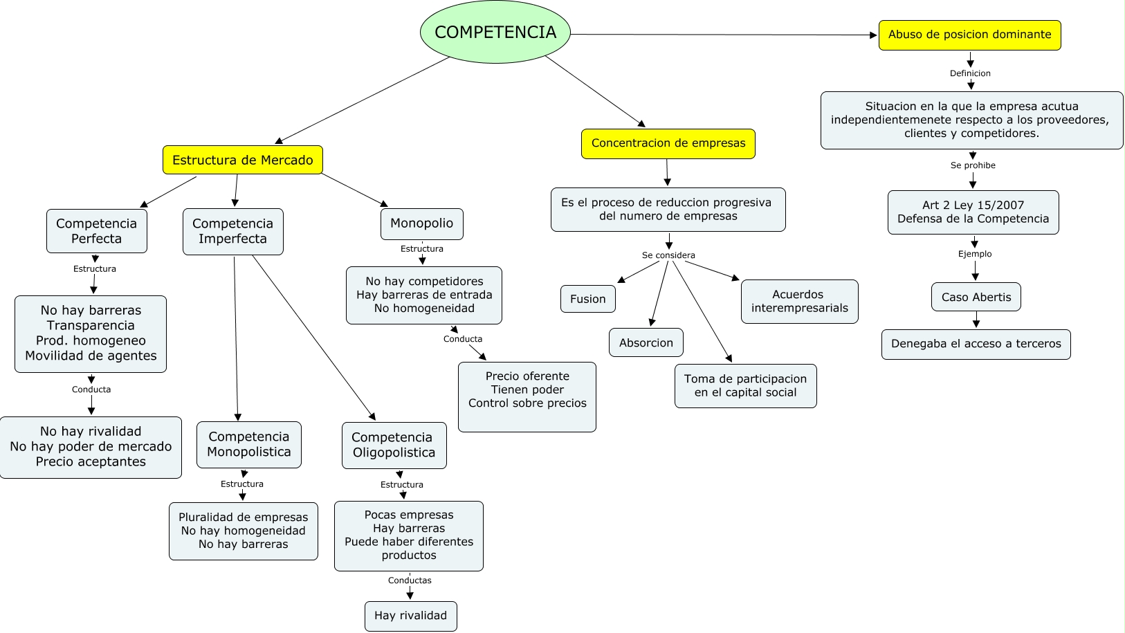 Este Cmap, tiene información relacionada con: Competencia I y II, COMPETENCIA ???? Abuso de posicion dominante, Es el proceso de reduccion progresiva del numero de empresas Se considera Absorcion, Caso Abertis ???? Denegaba el acceso a terceros, Estructura de Mercado ???? Monopolio, Es el proceso de reduccion progresiva del numero de empresas Se considera Toma de participacion en el capital social, No hay competidores Hay barreras de entrada No homogeneidad Conducta Precio oferente Tienen poder Control sobre precios, Competencia Oligopolistica Estructura Pocas empresas Hay barreras Puede haber diferentes productos, COMPETENCIA ???? Concentracion de empresas, Competencia Imperfecta ???? Competencia Monopolistica, Abuso de posicion dominante Definicion Situacion en la que la empresa acutua independientemenete respecto a los proveedores, clientes y competidores., COMPETENCIA ???? Estructura de Mercado, Situacion en la que la empresa acutua independientemenete respecto a los proveedores, clientes y competidores. Se prohibe Art 2 Ley 15/2007 Defensa de la Competencia, Estructura de Mercado ???? Competencia Perfecta, Competencia Monopolistica Estructura Pluralidad de empresas No hay homogeneidad No hay barreras, Es el proceso de reduccion progresiva del numero de empresas Se considera Acuerdos interempresarials, Monopolio Estructura No hay competidores Hay barreras de entrada No homogeneidad, Concentracion de empresas ???? Es el proceso de reduccion progresiva del numero de empresas, Art 2 Ley 15/2007 Defensa de la Competencia Ejemplo Caso Abertis, Pocas empresas Hay barreras Puede haber diferentes productos Conductas Hay rivalidad, Competencia Perfecta Estructura No hay barreras Transparencia Prod. homogeneo Movilidad de agentes