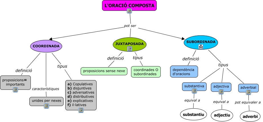 Aquest mapa conceptual conté informació relacionada amb: Presentació OC, L'ORACIÓ COMPOSTA pot ser JUXTAPOSADA, L'ORACIÓ COMPOSTA pot ser COORDINADA, SUBORDINADA tipus adjectiva, SUBORDINADA tipus adverbial, substantiva equival a substantiu, COORDINADA característiques unides per nexes, L'ORACIÓ COMPOSTA pot ser SUBORDINADA, SUBORDINADA definició dependència d'oracions, adjectiva equival a adjectiu, SUBORDINADA tipus substantiva, JUXTAPOSADA tipus coordinades O subordinades, adverbial pot equivaler a adverbi, COORDINADA tipus a) Copulatives b) disjuntives c) adversatives d) distributives e) explicatives f) il·latives, COORDINADA definició proposicions= importants, JUXTAPOSADA definició proposicions sense nexe