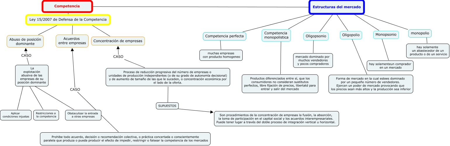 Este Cmap, tiene información relacionada con: competencia 1 Y 2, Obstaculizar la entrada a otras empresas ???? La explotación abusiva de las empresas de su posición dominante, Productos diferenciados entre sí, que los consumidores no consideran sustitutos perfectos, libre fijación de precios, libertatd para entrar y salir del mercado ???? Competencia monopolistica, hay solamente un abastecedor de un producto o de un servicio ???? monopolio, muchas empresas con producto homogeneo ???? Competencia perfecta, Competencia monopolistica ???? Estructuras del mercado, Prohibe todo acuerdo, decisión o recomendación colectiva, o práctica concertada o conscientemente paralela que produza o pueda producir el efecto de impedir, restringir o falsear la competencia de los mercados CASO Acuerdos entre empresas, Competencia perfecta ???? Estructuras del mercado, Monopsonio ???? Estructuras del mercado, Restricciones a la competencia ???? La explotación abusiva de las empresas de su posición dominante, mercado dominado por muchos vendedores y pocos compradores ???? Oligopsonio, monopolio ???? Estructuras del mercado, Estructuras del mercado ???? Competencia, Proceso de reducción progresiva del número de empresas o unidades de producción independientes (o de su grado de autonomía decisional) y de aumento de tamaño de las que le suceden, o concentración económica por el lado de la oferta. CASO Concentración de empresas, Oligopolio ???? Estructuras del mercado, Ley 15/2007 de Defensa de la Competencia ???? Competencia, hay solamente un abastecedor de un producto o de un servicio ???? ????, hay solamenteun comprador en un mercado ???? Monopsonio, Concentración de empresas ???? Ley 15/2007 de Defensa de la Competencia, Proceso de reducción progresiva del número de empresas o unidades de producción independientes (o de su grado de autonomía decisional) y de aumento de tamaño de las que le suceden, o concentración económica por el lado de la oferta. ???? Son procedimientos de la concentración de empresas la fusión, la absorción, la toma de participación en el capital social y los acuerdos interempresariales. Puede tener lugar a través del doble proceso de integración vertical u horizontal., Acuerdos entre empresas ???? Ley 15/2007 de Defensa de la Competencia