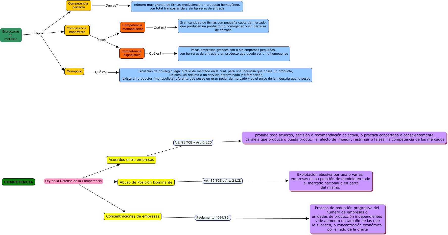 Este Cmap, tiene información relacionada con: tema 5-6, Estructuras de mercado tipos Competencia perfecta, Concentraciones de empresas Reglamento 4064/89 Proceso de reducción progresiva del número de empresas o unidades de producción independientes y de aumento de tamaño de las que le suceden, o concentración económica por el lado de la oferta, Competencia imperfecta tipos Competencia monopolística, Competencia perfecta Qué es? número muy grande de firmas produciendo un producto homogéneo, con total transparencia y sin barreras de entrada, Estructuras de mercado tipos Competencia imperfecta, Competencia oligopística Qué es? Pocas empresas grandes con o sin empresas pequeñas, con barreras de entrada y un producto que puede ser o no homogeneo, COMPETENCIA Ley de la Defensa de la Competencia Acuerdos entre empresas, COMPETENCIA Ley de la Defensa de la Competencia Concentraciones de empresas, COMPETENCIA Ley de la Defensa de la Competencia Abuso de Posición Dominante, Competencia monopolística Qué es? Gran cantidad de firmas con pequeña cuota de mercado, que producen un producto no homogéneo y sin barreras de entrada, Estructuras de mercado tipos Monopolio, Competencia imperfecta tipos Competencia oligopística, Acuerdos entre empresas Art. 81 TCE y Art. 1 LCD prohibe todo acuerdo, decisión o recomendación colectiva, o práctica concertada o conscientemente paralela que produza o pueda producir el efecto de impedir, restringir o falsear la competencia de los mercados, Monopolio Qué es? Situación de privilegio legal o fallo de mercado en la cual, para una industria que posee un producto, un bien, un recurso o un servicio determinado y diferenciado, existe un productor (monopolista) oferente que posee un gran poder de mercado y es el único de la industria que lo posee, Abuso de Posición Dominante Art. 82 TCE y Art. 2 LCD Explotación abusiva por una o varias empresas de su posición de dominio en todo el mercado nacional o en parte del mismo.