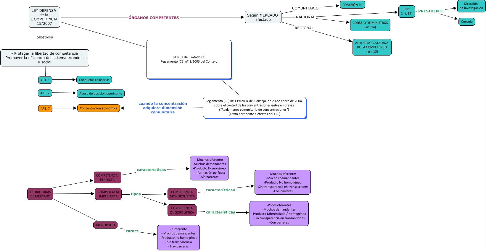 Este Cmap, tiene información relacionada con: Defensa Competencia, 81 y 82 del Tratado CE Reglamento (CE) nº 1/2003 del Consejo ???? Reglamento (CE) nº 139/2004 del Consejo, de 20 de enero de 2004, sobre el control de las concentraciones entre empresas (“Reglamento comunitario de concentraciones”) (Texto pertinente a efectos del EEE), CNC (art. 12) PRESIDENTE Dirección de Investigación, Según MERCADO afectado REGIONAL AUTORITAT CATALANA DE LA COMPETÈNCIA (art. 13), ESTRUCTURAS DE MERCADO ???? COMPETENCIA IMPERFECTA, COMPETENCIA OLIGOPOLÍSTICA características -Pocos oferentes -Muchos demandantes -Producto Diferenciado / Homogéneo -Sin transparencia en transacciones -Con barreras, COMPETENCIA PERFECTA características - Muchos oferentes -Muchos demandantes -Producto Homogéneo -Información perfecta -Sín barreras, ART. 1 ???? ART. 2, ART. 2 ???? Abuso de posición dominante, LEY DEFENSA de la COMPETENCIA 15/2007 objetivos - Proteger la libertad de competencia - Promover la eficiencia del sistema económico y social, Según MERCADO afectado NACIONAL CONSEJO DE MINISTROS (art. 14), - Proteger la libertad de competencia - Promover la eficiencia del sistema económico y social ???? ART. 1, MONOPOLIO caract. - 1 oferente - Muchos demandantes - Producto no homogéneo - Sin transparencia - Hay barreras, Según MERCADO afectado NACIONAL CNC (art. 12), 81 y 82 del Tratado CE Reglamento (CE) nº 1/2003 del Consejo ???? LEY DEFENSA de la COMPETENCIA 15/2007, ART. 7 ???? Concentración económica, LEY DEFENSA de la COMPETENCIA 15/2007 ÓRGANOS COMPETENTES Según MERCADO afectado, COMPETENCIA IMPERFECTA tipos COMPETENCIA OLIGOPOLÍSTICA, ART. 1 ???? Conductas colusorias, COMPETENCIA IMPERFECTA tipos COMPETENCIA MONOPOLÍSTICA, ART. 2 ???? ART. 7