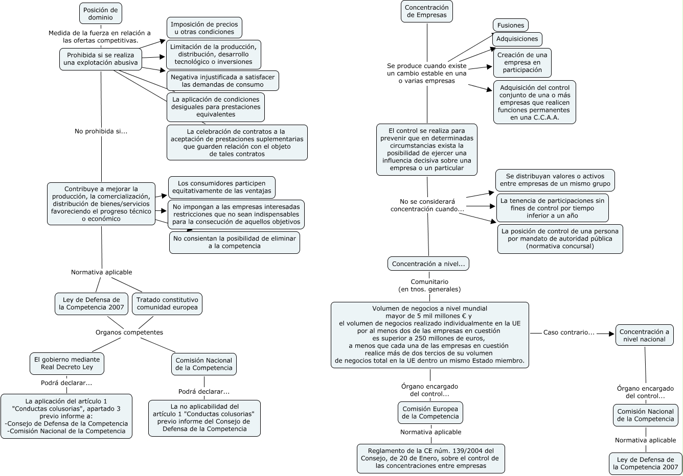 Este Cmap, tiene información relacionada con: Posición dominante y concentración de empresas, El control se realiza para prevenir que en determinadas circumstancias exista la posibilidad de ejercer una influencia decisiva sobre una empresa o un particular No se considerará concentración cuando... La posición de control de una persona por mandato de autoridad pública (normativa concursal), El control se realiza para prevenir que en determinadas circumstancias exista la posibilidad de ejercer una influencia decisiva sobre una empresa o un particular No se considerará concentración cuando... La tenencia de participaciones sin fines de control por tiempo inferior a un año, Prohibida si se realiza una explotación abusiva ???? Imposición de precios u otras condiciones, Concentración a nivel... Comunitario (en tnos. generales) Volumen de negocios a nivel mundial mayor de 5 mil millones € y el volumen de negocios realizado individualmente en la UE por al menos dos de las empresas en cuestión es superior a 250 millones de euros, a menos que cada una de las empresas en cuestión realice más de dos tercios de su volumen de negocios total en la UE dentro un mismo Estado miembro., Concentración de Empresas Se produce cuando existe un cambio estable en una o varias empresas Adquisición del control conjunto de una o más empresas que realicen funciones permanentes en una C.C.A.A., Contribuye a mejorar la producción, la comercialización, distribución de bienes/servicios favoreciendo el progreso técnico o económico ???? No consientan la posibilidad de eliminar a la competencia, Concentración de Empresas Se produce cuando existe un cambio estable en una o varias empresas Creación de una empresa en participación, Tratado constitutivo comunidad europea Organos competentes Comisión Nacional de la Competencia, Prohibida si se realiza una explotación abusiva No prohibida si... Contribuye a mejorar la producción, la comercialización, distribución de bienes/servicios favoreciendo el progreso técnico o económico, Contribuye a mejorar la producción, la comercialización, distribución de bienes/servicios favoreciendo el progreso técnico o económico Normativa aplicable Tratado constitutivo comunidad europea, Prohibida si se realiza una explotación abusiva ???? La aplicación de condiciones desiguales para prestaciones equivalentes, Tratado constitutivo comunidad europea Organos competentes El gobierno mediante Real Decreto Ley, Volumen de negocios a nivel mundial mayor de 5 mil millones € y el volumen de negocios realizado individualmente en la UE por al menos dos de las empresas en cuestión es superior a 250 millones de euros, a menos que cada una de las empresas en cuestión realice más de dos tercios de su volumen de negocios total en la UE dentro un mismo Estado miembro. Caso contrario... Concentración a nivel nacional, Ley de Defensa de la Competencia 2007 Organos competentes Comisión Nacional de la Competencia, Concentración de Empresas Se produce cuando existe un cambio estable en una o varias empresas Adquisiciones, Posición de dominio Medida de la fuerza en relación a las ofertas competitivas. Prohibida si se realiza una explotación abusiva, Prohibida si se realiza una explotación abusiva ???? La celebración de contratos a la aceptación de prestaciones suplementarias que guarden relación con el objeto de tales contratos, El gobierno mediante Real Decreto Ley Podrá declarar... La aplicación del artículo 1 "Conductas colusorias", apartado 3 previo informe a: -Consejo de Defensa de la Competencia -Comisión Nacional de la Competencia, Comisión Nacional de la Competencia Podrá declarar... La no aplicabilidad del artículo 1 "Conductas colusorias" previo informe del Consejo de Defensa de la Competencia, Ley de Defensa de la Competencia 2007 Organos competentes El gobierno mediante Real Decreto Ley