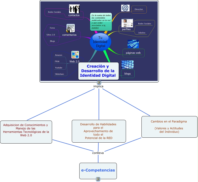 Este Cmap, tiene información relacionada con: MaEstela_ identidad_ digital, Creación y Desarrollo de la Identidad Digital ????, Cambios en el Paradigma (Valores y Actitudes del Individuo) conlleva e-Competencias, Desarrollo de Habilidades para el Aprovechamiento de todo el Potencial de la RED conlleva e-Competencias, Adquisicion de Conocimientos y Manejo de las Herramientas Tecnológicas de la Web 2.0 conlleva e-Competencias, Creación y Desarrollo de la Identidad Digital implica Adquisicion de Conocimientos y Manejo de las Herramientas Tecnológicas de la Web 2.0, Creación y Desarrollo de la Identidad Digital implica Cambios en el Paradigma (Valores y Actitudes del Individuo), Creación y Desarrollo de la Identidad Digital implica Desarrollo de Habilidades para el Aprovechamiento de todo el Potencial de la RED