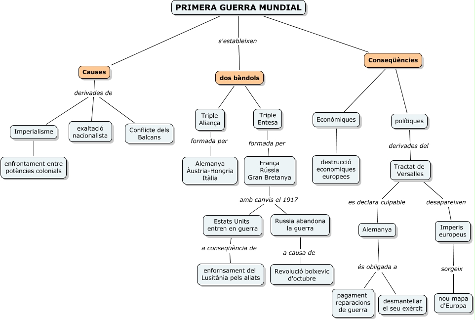 Este Cmap, tiene información relacionada con: primera_guerra_mundial, Econòmiques destrucció economiques europees, polítiques derivades del Tractat de Versalles, Conseqüències polítiques, Estats Units entren en guerra a conseqüència de enfornsament del Lusitània pels aliats, França Rússia Gran Bretanya amb canvis el 1917 Russia abandona la guerra, Alemanya és obligada a desmantellar el seu exèrcit, dos bàndols Triple Entesa, Tractat de Versalles desapareixen Imperis europeus, França Rússia Gran Bretanya amb canvis el 1917 Estats Units entren en guerra, Alemanya és obligada a pagament reparacions de guerra, Tractat de Versalles es declara culpable Alemanya, PRIMERA GUERRA MUNDIAL Conseqüències, Causes derivades de Imperialisme, Conseqüències Econòmiques, Causes derivades de Conflicte dels Balcans, dos bàndols Triple Aliança, Imperialisme enfrontament entre potències colonials, Triple Aliança formada per Alemanya Àustria-Hongria Itàlia, Russia abandona la guerra a causa de Revolució bolxevic d'octubre, PRIMERA GUERRA MUNDIAL s'estableixen dos bàndols