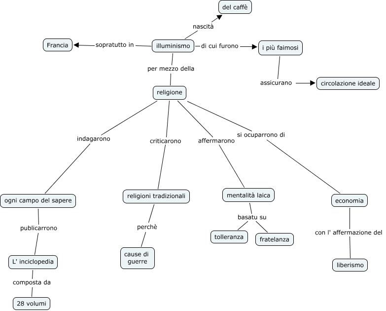 Questa Cmap, creata con IHMC CmapTools, contiene informazioni relative a: il illuminismo, religioni tradizionali perchè cause di guerre, religione criticarono religioni tradizionali, illuminismo per mezzo della religione, mentalità laica basatu su fratelanza, religione si ocuparrono di economia, religione affermarono mentalità laica, illuminismo nascità del caffè, mentalità laica basatu su tolleranza, i più faimosi assicurano circolazione ideale, ogni campo del sapere publicarrono L' inciclopedia, illuminismo di cui furono i più faimosi, religione indagarono ogni campo del sapere, illuminismo sopratutto in Francia, L' inciclopedia composta da 28 volumi, economia con l' affermazione del liberismo