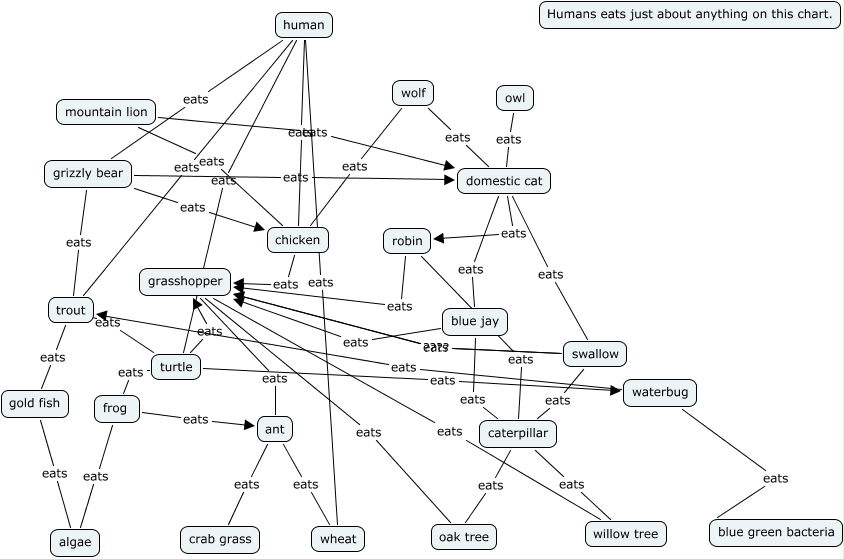 This Concept Map, created with IHMC CmapTools, has information related to: tyler rusby, mountain lion eats chicken, grizzly bear eats chicken, swallow eats caterpillar, turtle eats trout, waterbug eats blue green bacteria, human eats grizzly bear, ant eats crab grass, owl eats domestic cat, mountain lion eats domestic cat, human eats trout, human eats chicken, trout eats gold fish, domestic cat eats blue jay, grasshopper eats ant, turtle eats waterbug, human eats wheat, turtle eats grasshopper, caterpillar eats willow tree, swallow ???? grasshopper, grasshopper eats oak tree