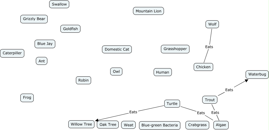 This Concept Map, created with IHMC CmapTools, has information related to: wilczach, Turtle Eats Willow Tree, Wolf Eats Chicken, Turtle Eats Algae, Trout Eats Waterbug, Trout Eats Algae