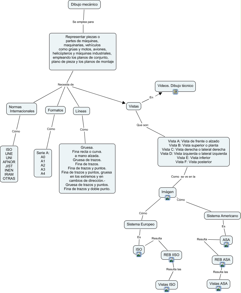 Este Cmap, tiene información relacionada con: Dibujo Mapa Conceptual, Vista A: Vista de frente o alzado Vista B: Vista superior o planta Vista C: Vista derecha o lateral derecha Vista D: Vista izquierda o lateral izquierda Vista E: Vista inferior Vista F: Vista posterior Como se ve en la Imágen, Vistas En Videos. Dibujo técnico, Sistema Europeo Es ISO, Representar piezas o partes de máquinas, maquinarias, vehículos como grúas y motos, aviones, helicópteros y máquinas industriales, empleando los planos de conjunto, plano de pieza y los planos de montaje Necesita de Normas Internacionales, Representar piezas o partes de máquinas, maquinarias, vehículos como grúas y motos, aviones, helicópteros y máquinas industriales, empleando los planos de conjunto, plano de pieza y los planos de montaje Necesita de Líneas, Normas Internacionales Cómo ISO UNE UNI AFNOR JIST INEN IRAM OTRAS, ASA Resulta REB ASA, Vistas Que son: Vista A: Vista de frente o alzado Vista B: Vista superior o planta Vista C: Vista derecha o lateral derecha Vista D: Vista izquierda o lateral izquierda Vista E: Vista inferior Vista F: Vista posterior, REB IISO Resulta las Vistas ISO, Representar piezas o partes de máquinas, maquinarias, vehículos como grúas y motos, aviones, helicópteros y máquinas industriales, empleando los planos de conjunto, plano de pieza y los planos de montaje Necesita de Formatos, Imágen Cómo Sistema Europeo, ISO Resulta REB IISO, Imágen Cómo Sistema Americano, Representar piezas o partes de máquinas, maquinarias, vehículos como grúas y motos, aviones, helicópteros y máquinas industriales, empleando los planos de conjunto, plano de pieza y los planos de montaje Necesita de Vistas, Dibujo mecánico Se emplea para Representar piezas o partes de máquinas, maquinarias, vehículos como grúas y motos, aviones, helicópteros y máquinas industriales, empleando los planos de conjunto, plano de pieza y los planos de montaje, Líneas Cómo Gruesa. Fina recta o curva. a mano alzada. Gruesa de trazos. Fina de trazos. Fina de trazos y puntos. Fina de trazos y puntos, gruesa en los extremos y en cambios de dirección.- Gruesa de trazos y puntos. Fina de trazos y doble punto., REB ASA Resulta las Vistas ASA, Formatos Cómo Serie A: A0 A1 A2 A3 A4, Sistema Americano Es ASA