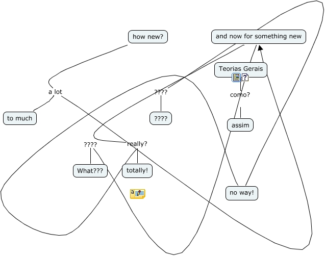 This Concept Map, created with IHMC CmapTools, has information related to: Teorias Gerais, how new? a lot to much, and now for something new ???? What???, how new? a lot and now for something new, Teorias Gerais como? assim, and now for something new really? totally!, no way! ???? ????, no way! really? totally!
