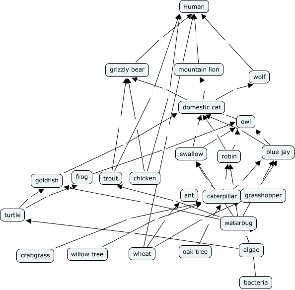 This Concept Map, created with IHMC CmapTools, has information related to: brendan york, algae waterbug, waterbug robin, turtle frog, frog owl, domestic cat wolf, mountain lion Human, waterbug trout, chicken Human, goldfish domestic cat, blue jay domestic cat, domestic cat mountain lion, trout grizzly bear, bacteria \ algae, wheat ant, swallow owl, grizzly bear Human, turtle goldfish, trout Human, waterbug goldfish, domestic cat grizzly bear