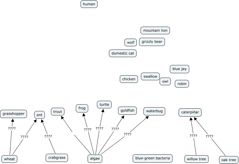 This Concept Map, created with IHMC CmapTools, has information related to: kleiwhit, willow tree ???? caterpillar, crabgrass ???? ant, wheat ???? ant, algae ???? frog, oak tree ???? caterpillar, algae ???? waterbug, wheat ???? grasshopper, algae trout, algae ???? turtle, algae ???? goldfish