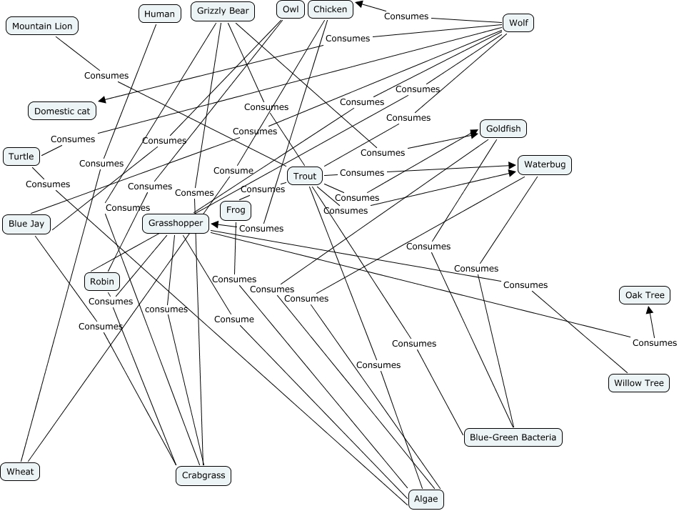 This Concept Map, created with IHMC CmapTools, has information related to: cousjenn.2012, Grasshopper Consumes Oak Tree, Grasshopper Consume Algae, Trout Consumes Waterbug, Grasshopper consumes Crabgrass, Grizzly Bear Consumes Trout, Trout Consumes Algae, Wolf Consumes Grasshopper, Owl Consumes Robin, Chicken Consume Wheat, Waterbug Consumes Algae, Trout Consumes Goldfish, Grizzly Bear Consumes Crabgrass, Waterbug Consumes Blue-Green Bacteria, Blue Jay Consumes Crabgrass, Grizzly Bear Consmes Crabgrass, Goldfish Consumes Blue-Green Bacteria, Wolf Consumes Trout, Wolf Consumes Robin, Owl Consumes Blue Jay, Wolf Consumes Chicken