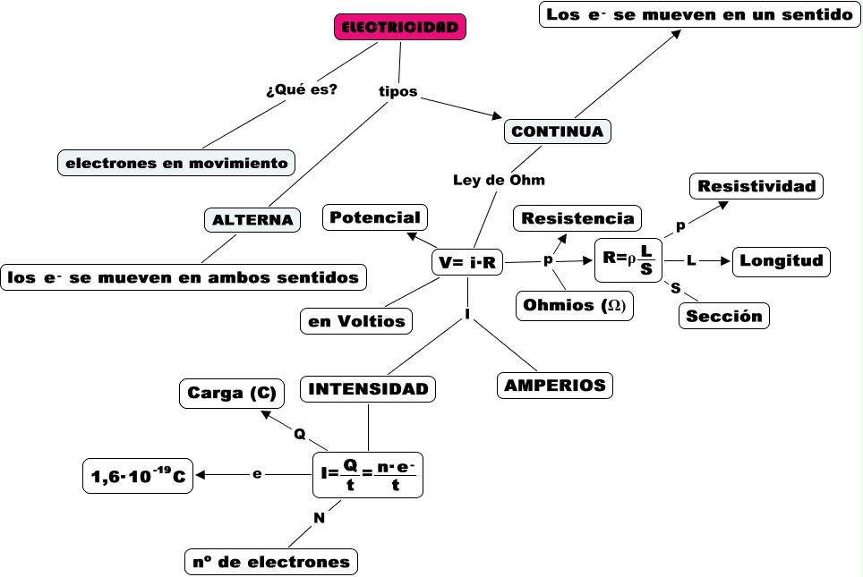 Este mapa conceptual tiene información relacionada a: Anna Tasa Candela =D, CONTINUA <math xmlns="http://www.w3.org/1998/Math/MathML"> <mrow> <mtext> Los </mtext> <mmultiscripts> <mtext> e </mtext> <none/> <mtext> - </mtext> </mmultiscripts> <mtext> se mueven en un sentido </mtext> </mrow> </math>, <math xmlns="http://www.w3.org/1998/Math/MathML"> <mrow> <mtext> R=ρ </mtext> <mfrac> <mtext> L </mtext> <mtext> S </mtext> </mfrac> </mrow> </math> L Longitud, V= i·R p Ohmios (Ω), INTENSIDAD <math xmlns="http://www.w3.org/1998/Math/MathML"> <mrow> <mtext> I= </mtext> <mfrac> <mtext> Q </mtext> <mtext> t </mtext> </mfrac> <mtext> = </mtext> <mfrac> <mrow> <mtext> n· </mtext> <mmultiscripts> <mtext> e </mtext> <none/> <mtext> - </mtext> </mmultiscripts> </mrow> <mtext> t </mtext> </mfrac> </mrow> </math>, ELECTRICIDAD tipos ALTERNA, V= i·R I INTENSIDAD, ALTERNA <math xmlns="http://www.w3.org/1998/Math/MathML"> <mrow> <mtext> los </mtext> <mmultiscripts> <mtext> e </mtext> <none/> <mtext> - </mtext> </mmultiscripts> <mtext> se mueven en ambos sentidos </mtext> </mrow> </math>, V= i·R en Voltios, V= i·R p <math xmlns="http://www.w3.org/1998/Math/MathML"> <mrow> <mtext> R=ρ </mtext> <mfrac> <mtext> L </mtext> <mtext> S </mtext> </mfrac> </mrow> </math>, ELECTRICIDAD ¿Qué es? electrones en movimiento, <math xmlns="http://www.w3.org/1998/Math/MathML"> <mrow> <mtext> R=ρ </mtext> <mfrac> <mtext> L </mtext> <mtext> S </mtext> </mfrac> </mrow> </math> S Sección, V= i·R Potencial, <math xmlns="http://www.w3.org/1998/Math/MathML"> <mrow> <mtext> I= </mtext> <mfrac> <mtext> Q </mtext> <mtext> t </mtext> </mfrac> <mtext> = </mtext> <mfrac> <mrow> <mtext> n· </mtext> <mmultiscripts> <mtext> e </mtext> <none/> <mtext> - </mtext> </mmultiscripts> </mrow> <mtext> t </mtext> </mfrac> </mrow> </math> e <math xmlns="http://www.w3.org/1998/Math/MathML"> <mrow> <mtext> 1,6· </mtext> <mmultiscripts> <mtext> 10 </mtext> <none/> <mtext> -19 </mtext> </mmultiscripts> <mtext> C </mtext> </mrow> </math>, <math xmlns="http://www.w3.org/1998/Math/MathML"> <mrow> <mtext> I= </mtext> <mfrac> <mtext> Q </mtext> <mtext> t </mtext> </mfrac> <mtext> = </mtext> <mfrac> <mrow> <mtext> n· </mtext> <mmultiscripts> <mtext> e </mtext> <none/> <mtext> - </mtext> </mmultiscripts> </mrow> <mtext> t </mtext> </mfrac> </mrow> </math> N nº de electrones, V= i·R p Resistencia, <math xmlns="http://www.w3.org/1998/Math/MathML"> <mrow> <mtext> R=ρ </mtext> <mfrac> <mtext> L </mtext> <mtext> S </mtext> </mfrac> </mrow> </math> p Resistividad, CONTINUA Ley de Ohm V= i·R, ELECTRICIDAD tipos CONTINUA, V= i·R I AMPERIOS, <math xmlns="http://www.w3.org/1998/Math/MathML"> <mrow> <mtext> I= </mtext> <mfrac> <mtext> Q </mtext> <mtext> t </mtext> </mfrac> <mtext> = </mtext> <mfrac> <mrow> <mtext> n· </mtext> <mmultiscripts> <mtext> e </mtext> <none/> <mtext> - </mtext> </mmultiscripts> </mrow> <mtext> t </mtext> </mfrac> </mrow> </math> Q Carga (C)