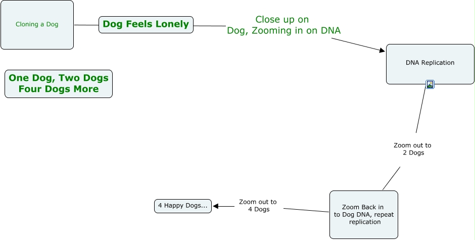 This Concept Map, created with IHMC CmapTools, has information related to: 1 Dog, 2 Dog, 4 Dogs More, DNA Replication Zoom out to 2 Dogs Zoom Back in to Dog DNA, repeat replication, Cloning a Dog Close up on Dog, Zooming in on DNA DNA Replication, Zoom Back in to Dog DNA, repeat replication Zoom out to 4 Dogs 4 Happy Dogs...