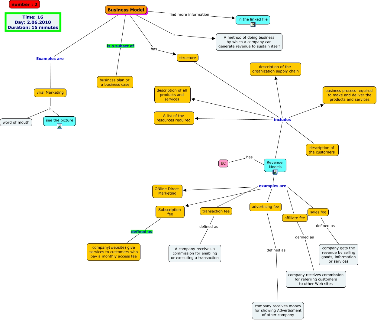 This Concept Map, created with IHMC CmapTools, has information related to: Business Model - Faraji, Revenue Models examples are ONline Direct Marketing, transaction fee defined as A company receives a commission for enabling or executing a transaction, Business Model is a subset of business plan or a business case, Business Model Examples are viral Marketing, Revenue Models examples are transaction fee, affiliate fee defined as company receives commission for referring customers to other Web sites, structure includes description of all products and services, structure includes Revenue Models, advertising fee defined as company receives money for showing Advertisment of other company, Business Model find more information in the linked file, structure includes business process required to make and deliver the products and services, Revenue Models examples are Subscription fee, Revenue Models examples are advertising fee, viral Marketing is word of mouth, Business Model is A method of doing business by which a company can generate revenue to sustain itself, Revenue Models examples are affiliate fee, EC has Revenue Models, Revenue Models examples are sales fee, viral Marketing is see the picture, Business Model has structure