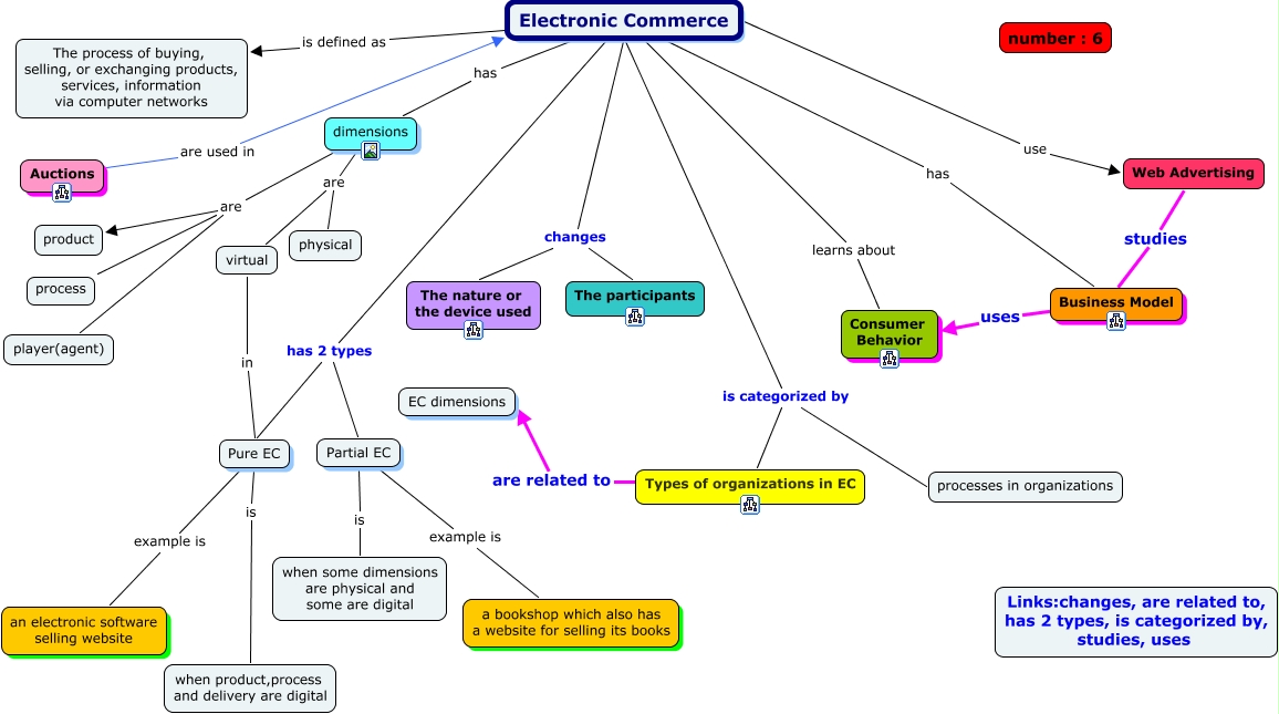 This Concept Map, created with IHMC CmapTools, has information related to: Map of Maps -Faraji, Pure EC example is an electronic software selling website, dimensions are product, dimensions are process, dimensions are physical, Auctions are used in Electronic Commerce, Electronic Commerce use Web Advertising, Partial EC example is a bookshop which also has a website for selling its books, Electronic Commerce is categorized by processes in organizations, Electronic Commerce learns about Consumer Behavior, Electronic Commerce has Business Model, dimensions are player(agent), Web Advertising studies Business Model, Electronic Commerce has 2 types Pure EC, Business Model uses Consumer Behavior, Electronic Commerce changes The nature or the device used, Electronic Commerce is defined as The process of buying, selling, or exchanging products, services, information via computer networks, Electronic Commerce has dimensions, virtual in Pure EC, Types of organizations in EC are related to EC dimensions, Electronic Commerce is categorized by Types of organizations in EC