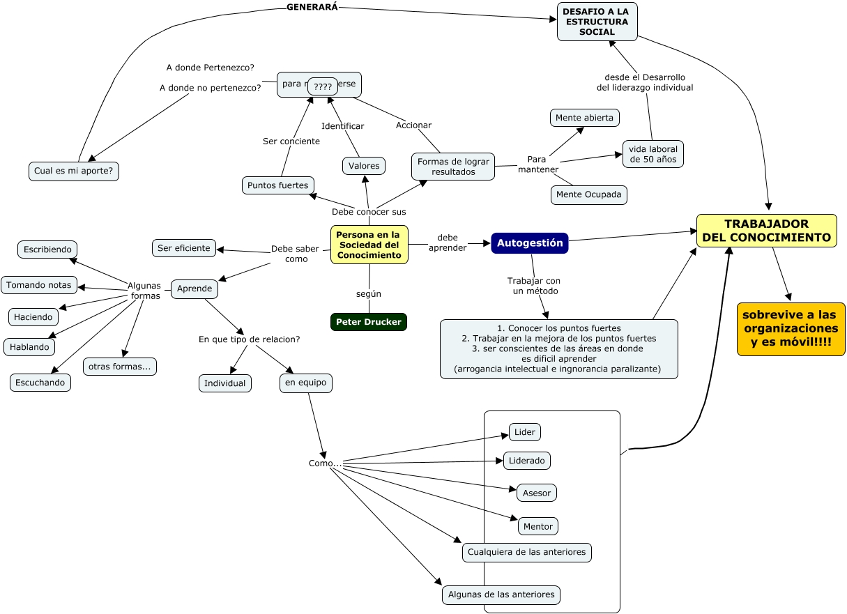 Este Cmap, tiene información relacionada con: Liderazgo y Autogestion, Persona en la Sociedad del Conocimiento Debe conocer sus Puntos fuertes, Persona en la Sociedad del Conocimiento según Peter Drucker, Persona en la Sociedad del Conocimiento debe aprender Autogestión, Formas de lograr resultados Para mantener Mente Ocupada, en equipo Como... Cualquiera de las anteriores, Persona en la Sociedad del Conocimiento Debe conocer sus Formas de lograr resultados, 1. Conocer los puntos fuertes 2. Trabajar en la mejora de los puntos fuertes 3. ser conscientes de las áreas en donde es dificil aprender (arrogancia intelectual e ingnorancia paralizante) ???? TRABAJADOR DEL CONOCIMIENTO, Aprende Algunas formas Escribiendo, Persona en la Sociedad del Conocimiento Debe saber como Aprende, TRABAJADOR DEL CONOCIMIENTO ???? sobrevive a las organizaciones y es móvil!!!!, en equipo Como... Lider, Formas de lograr resultados Accionar, Aprende Algunas formas Hablando, Aprende Algunas formas Tomando notas, ???? ????, Autogestión ???? TRABAJADOR DEL CONOCIMIENTO, en equipo Como... Mentor, Aprende En que tipo de relacion? Individual, para responderse A donde Pertenezco? A donde no pertenezco? Cual es mi aporte?, vida laboral de 50 años desde el Desarrollo del liderazgo individual ????