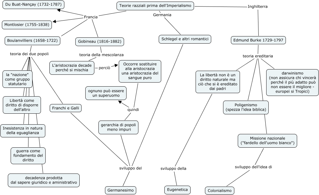 Questa Cmap, creata con IHMC CmapTools, contiene informazioni relative a: Teorie razziali prima dell'Imperialismo, Occorre sostituire alla aristocrazia una aristocrazia del sangue puro quindi gerarchia di popoli meno impuri, Franchi e Galli sviluppo del Germanesimo, Boulanvilliers (1658-1722) teoria dei due popoli Inesistenza in natura della eguaglianza, Occorre sostituire alla aristocrazia una aristocrazia del sangue puro quindi ognuno può essere un superuomo, L'aristocrazia decade perché si mischia perciò Occorre sostituire alla aristocrazia una aristocrazia del sangue puro, Boulanvilliers (1658-1722) teoria dei due popoli Libertà come diritto di disporre dell'altro, Boulanvilliers (1658-1722) teoria dei due popoli guerra come fondamento del diritto, La libertà non è un diritto naturale ma ciò che si è ereditato dai padri sviluppo della Eugenetica, Edmund Burke 1729-1797 teoria ereditaria Poligenismo (spezza l'idea biblica), Edmund Burke 1729-1797 teoria ereditaria Missione nazionale ("fardello dell'uomo bianco"), Boulanvilliers (1658-1722) teoria dei due popoli Franchi e Galli, gerarchia di popoli meno impuri sviluppo del Germanesimo, Teorie razziali prima dell'Imperialismo Francia Du Buat-Nançay (1732-1787), Boulanvilliers (1658-1722) teoria dei due popoli decadenza prodotta dal sapere giuridico e aministrativo, Gobineau (1816-1882) teoria della mescolanza L'aristocrazia decade perché si mischia, Teorie razziali prima dell'Imperialismo Inghilterra Edmund Burke 1729-1797, Teorie razziali prima dell'Imperialismo Francia Montlosier (1755-1838), Edmund Burke 1729-1797 teoria ereditaria darwinismo (non assicura chi vincerà perché il più adatto può non essere il migliore - europei si Tropici), Boulanvilliers (1658-1722) teoria dei due popoli la "nazione" come gruppo statutario, Teorie razziali prima dell'Imperialismo Francia Gobineau (1816-1882)