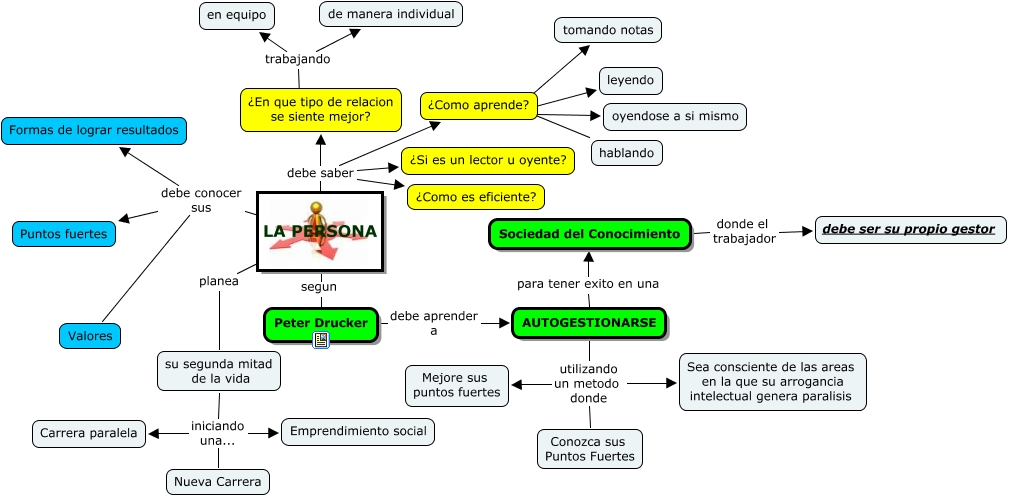 Este Cmap, tiene información relacionada con: Conocerse a si mismo, ¿Como aprende? ???? tomando notas, Peter Drucker debe aprender a AUTOGESTIONARSE, AUTOGESTIONARSE utilizando un metodo donde Mejore sus puntos fuertes, ???? trabajando de manera individual, ???? trabajando en equipo, AUTOGESTIONARSE para tener exito en una Sociedad del Conocimiento, LA PERSONA debe conocer sus Valores, ¿Como aprende? ???? hablando, su segunda mitad de la vida iniciando una... Emprendimiento social, su segunda mitad de la vida iniciando una... Carrera paralela, LA PERSONA debe saber ¿En que tipo de relacion se siente mejor?, Sociedad del Conocimiento donde el trabajador debe ser su propio gestor, AUTOGESTIONARSE utilizando un metodo donde Conozca sus Puntos Fuertes, ¿Como aprende? ???? oyendose a si mismo, LA PERSONA planea su segunda mitad de la vida, LA PERSONA debe conocer sus Puntos fuertes, LA PERSONA debe saber ¿Si es un lector u oyente?, LA PERSONA segun Peter Drucker, su segunda mitad de la vida iniciando una... Nueva Carrera, LA PERSONA debe saber ¿Como aprende?