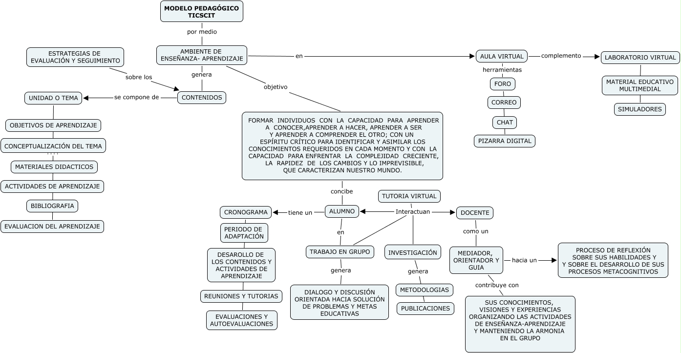 Este Cmap, tiene información relacionada con: MODELO PEDAGOGICO TICSCIT, CRONOGRAMA ???? EVALUACIONES Y AUTOEVALUACIONES, TUTORIA VIRTUAL Interactuan ALUMNO, INVESTIGACIÓN genera PUBLICACIONES, ESTRATEGIAS DE EVALUACIÓN Y SEGUIMIENTO sobre los CONTENIDOS, ALUMNO tiene un CRONOGRAMA, AMBIENTE DE ENSEÑANZA- APRENDIZAJE genera CONTENIDOS, TUTORIA VIRTUAL Interactuan DOCENTE, ALUMNO en TRABAJO EN GRUPO, UNIDAD O TEMA ???? EVALUACION DEL APRENDIZAJE, AULA VIRTUAL herramientas FORO, DOCENTE como un MEDIADOR, ORIENTADOR Y GUIA, MODELO PEDAGÓGICO TICSCIT por medio AMBIENTE DE ENSEÑANZA- APRENDIZAJE, ALUMNO Interactuan TRABAJO EN GRUPO, MEDIADOR, ORIENTADOR Y GUIA contribuye con SUS CONOCIMIENTOS, VISIONES Y EXPERIENCIAS ORGANIZANDO LAS ACTIVIDADES DE ENSEÑANZA-APRENDIZAJE Y MANTENIENDO LA ARMONIA EN EL GRUPO, AMBIENTE DE ENSEÑANZA- APRENDIZAJE en AULA VIRTUAL, TRABAJO EN GRUPO genera DIALOGO Y DISCUSIÓN ORIENTADA HACIA SOLUCIÓN DE PROBLEMAS Y METAS EDUCATIVAS, TUTORIA VIRTUAL Interactuan INVESTIGACIÓN, ALUMNO Interactuan DOCENTE, FORO ???? PIZARRA DIGITAL, ALUMNO Interactuan INVESTIGACIÓN