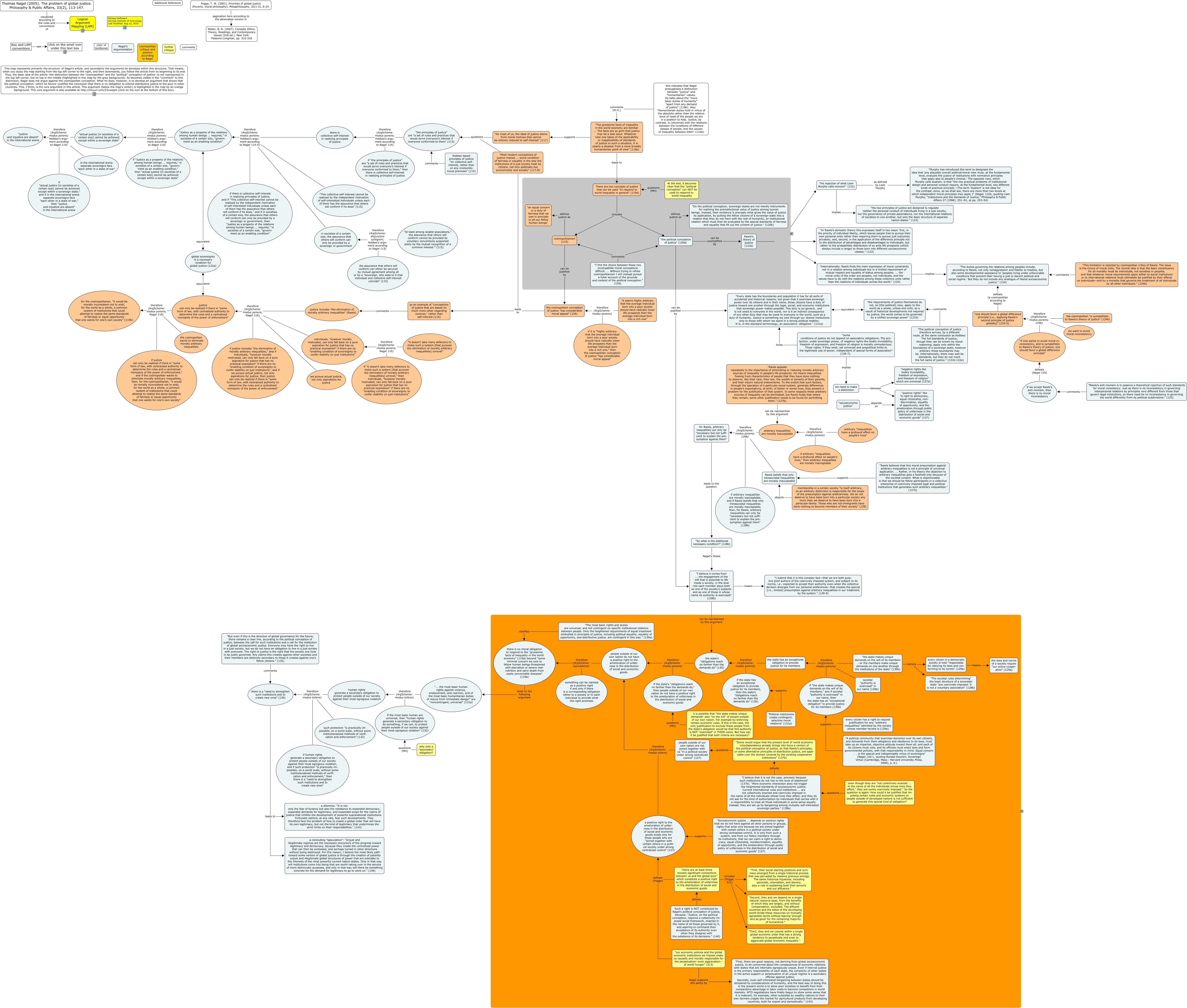 This Concept Map, created with IHMC CmapTools, has information related to: Nagel_2005_global-justice_map, justice includes "the elimination of morally arbitrary inequalities" (Rawls) therefore (ArgScheme: modus ponens; Nagel 116) justice can only be realized if there is "some form of law, with centralized authority to determine the rules and a centralized monopoly of the power of enforcement", "Most modern conceptions of justice impose ... some condition of fairness or equality in the way the institutions of a just society treat its citizens, not only politically but economically and socially" (117-8) questions "the principles of justice" are "a set of rules and practices that would serve everyone’s interest if everyone conformed to them" (115), "some conditions of justice do not depend on associative obligations. The pro- tection, under sovereign power, of negative rights like bodily inviolability, freedom of expression, and freedom of religion is morally unmysterious. Those rights, if they exist, set universal and prepolitical limits to the legitimate use of power, independent of special forms of association" (126-7). implies we need to make a distinction, "one should favor a global difference principle [i.e., applying Rawls's second principle of justice globally]" (124-5) defeats (a cosmopolitan according to Nagel) "The duties governing the relations among peoples include, according to Rawls, not only nonaggression and fidelity to treaties, but also some developmental assistance to 'peoples living under unfavorable conditions that prevent their having a just or decent political and social regime.' But they do not include any analogue of liberal socioeconomic justice." (124), Rawls beliefs that only intrasocietal inequalities are morally inacceptable therefore (ArgScheme: modus ponens; 128b) for Rawls, arbitrary inequalities can only be "necessary but not suffi- cient to explain the pre- sumption against them", Rawls's theory of justice (122a) includes "his rejection of what Liam Murphy calls monism" (122), "The most basic rights and duties are universal, and not contingent on specific institutional relations between people. Only the heightened requirements of equal treatment embodied in principles of justice, including political equality, equality of opportunity, and distributive justice, are contingent in this way." (130a) clarifies there is no moral obligation to respond to the "gruesome facts of inequality in the world economy" (118a) beyond "some minimal concern we owe to fellow human beings threatened with starvation or severe mal- nutrition and early death from easily preventable diseases" (118a), Thomas Nagel (2005). The problem of global justice. Philosophy & Public Affairs, 33(2), 113-147. visualized according to the rules and conventions of Logical Argument Mapping (LAM), as an example of "conceptions of justice that are based on much more other-regarding motives," rather than self-interest (116) comments justice includes "the elimination of morally arbitrary inequalities" (Rawls), "there are at least three morally significant connections between us and the global poor" which constitute a positive right to the amelioration of unfairness in the distribution of social and economic goods includes (Pogge, 313) "Third, they and we coexist within a single global economic order that has a strong tendency to perpetuate and even to aggrevate global economic inequality.", if the most basic human are universal, then "human rights generate a secondary obligation to do something, if we can, to protect people outside of our society against their most egregious violation" (132) therefore (ArgScheme: modus tollens) human rights generate a secondary obligation to protect people outside of our society against their most egregious violation, There are two concepts of justice that can be used "to respond to world inequality in general" (119a) includes cosmopolitanism (119), "our economic policies and the global economic institutions we impose make us causally and morally responsible for the perpetuation--even aggravation-- of world hunger" (313) Nagel supports this partly by "First, there are good reasons, not deriving from global socioeconomic justice, to be concerned about the consequences of economic relations with states that are internally egregiously unjust. Even if internal justice is the primary responsibility of each state, the complicity of other states in the active support or perpetuation of an unjust regime is a secondary offense against justice. Secondly, even self-interested bargaining between states should be tempered by considerations of humanity, and the best way of doing this in the present world is to allow poor societies to benefit from their comparative advantage in labor costs to become competitors in world markets. WTO negotiations have finally begun to show some sense that it is indecent, for example, when subsidies by wealthy nations to their own farmers cripple the market for agricultural products from developing countries, both for export and domestically." (143), "Some would argue that the present level of world economic interdependence already brings into force a version of the political conception of justice, so that Rawls’s principles, or some alternative principles of distributive justice, are appli- cable over the domain covered by the existing cooperative institutions" (137b) questions people outside of our own nation are not joined together with us "in a political society under strong centralized control" (127), "Political institutions create contingent, selective moral relations" (131a) supports if the state has an exceptional obligation to provide justice for its members, then the state's "obligations reach no farther than the demands do" (130), cosmopolitanism (119) can be justified by the cosmopolitan conception of justice "has considerable moral appeal" (126), the cosmopolitan conception of justice "has considerable moral appeal" (126) leads to as an