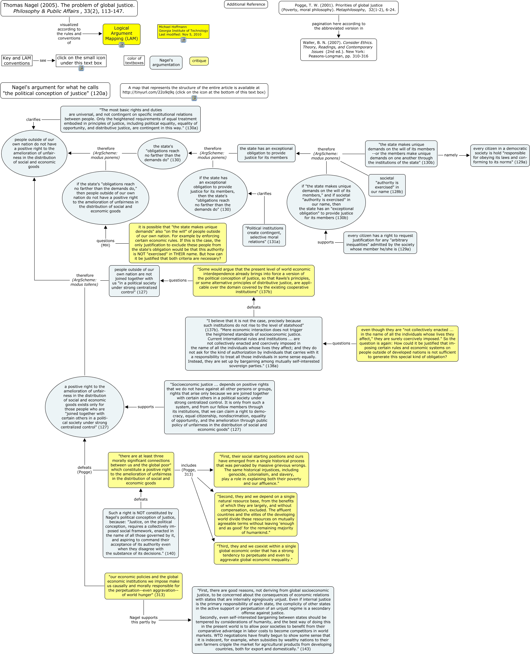 This Concept Map, created with IHMC CmapTools, has information related to: Nagel_2005_core-argument, the state has an exceptional obligation to provide justice for its members therefore (ArgScheme: modus ponens) the state's "obligations reach no farther than the demands do" (130), "there are at least three morally significant connections between us and the global poor" which constitute a positive right to the amelioration of unfairness in the distribution of social and economic goods includes (Pogge, 313) "Third, they and we coexist within a single global economic order that has a strong tendency to perpetuate and even to aggrevate global economic inequality.", Thomas Nagel (2005). The problem of global justice. Philosophy & Public Affairs, 33(2), 113-147. visualized according to the rules and conventions of Logical Argument Mapping (LAM), "there are at least three morally significant connections between us and the global poor" which constitute a positive right to the amelioration of unfairness in the distribution of social and economic goods includes (Pogge, 313) "First, their social starting positions and ours have emerged from a single historical process that was pervaded by massive grievous wrongs. The same historical injustices, including genocide, colonialism, and slavery, play a role in explaining both their poverty and our affluence.", "our economic policies and the global economic institutions we impose make us causally and morally responsible for the perpetuation--even aggravation-- of world hunger" (313) Nagel supports this partly by "First, there are good reasons, not deriving from global socioeconomic justice, to be concerned about the consequences of economic relations with states that are internally egregiously unjust. Even if internal justice is the primary responsibility of each state, the complicity of other states in the active support or perpetuation of an unjust regime is a secondary offense against justice. Secondly, even self-interested bargaining between states should be tempered by considerations of humanity, and the best way of doing this in the present world is to allow poor societies to benefit from their comparative advantage in labor costs to become competitors in world markets. WTO negotiations have finally begun to show some sense that it is indecent, for example, when subsidies by wealthy nations to their own farmers cripple the market for agricultural products from developing countries, both for export and domestically." (143), "Some would argue that the present level of world economic interdependence already brings into force a version of the political conception of justice, so that Rawls’s principles, or some alternative principles of distributive justice, are appli- cable over the domain covered by the existing cooperative institutions" (137b) questions people outside of our own nation are not joined together with us "in a political society under strong centralized control" (127), the state's "obligations reach no farther than the demands do" (130) therefore (ArgScheme: modus ponens) people outside of our own nation do not have a positive right to the amelioration of unfair- ness in the distribution of social and economic goods, "Political institutions create contingent, selective moral relations" (131a) clarifies if the state has an exceptional obligation to provide justice for its members, then the state's "obligations reach no farther than the demands do" (130), "there are at least three morally significant connections between us and the global poor" which constitute a positive right to the amelioration of unfairness in the distribution of social and economic goods includes (Pogge, 313) "Second, they and we depend on a single natural resource base, from the benefits of which they are largely, and without compensation, excluded. The affluent countries and the elites of the developing world divide these resources on mutually agreeable terms without leaving 'enough and as good' for the remaining majority of humankind.", if the state has an exceptional obligation to provide justice for its members, then the state's "obligations reach no farther than the demands do" (130) therefore (ArgScheme: modus ponens) the state's "obligations reach no farther than the demands do" (130), Pogge, T. W. (2001). Priorities of global justice (Poverty, moral philosophy). Metaphilosophy, 32(1-2), 6-24. pagination here according to the abbreviated version in Waller, B. N. (2007). Consider Ethics. Theory, Readings, and Contemporary Issues (2nd ed.). New York: Peasons-Longman, pp. 310-316, "Socioeconomic justice ... depends on positive rights that we do not have against all other persons or groups, rights that arise only because we are joined together with certain others in a political society under strong centralized control. It is only from such a system, and from our fellow members through its institutions, that we can claim a right to demo- cracy, equal citizenship, nondiscrimation, equality of opportunity, and the amelioration through public policy of unfairness in the distribution of social and economic goods" (127) supports a positive right to the amelioration of unfair- ness in the distribution of social and economic goods exists only for those people who are "joined together with certain others in a politi- cal society under strong centralized control" (127), a positive right to the amelioration of unfair- ness in the distribution of social and economic goods exists only for those people who are "joined together with certain others in a politi- cal society under strong centralized control" (127) therefore (ArgScheme: modus tollens) people outside of our own nation do not have a positive right to the amelioration of unfair- ness in the distribution of social and economic goods, "I believe that it is not the case, precisely because such institutions do not rise to the level of statehood" (137b). "Mere economic interaction does not trigger the heightened standards of