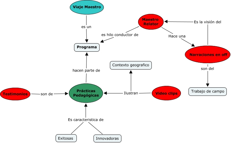Este Cmap, tiene información relacionada con: MARTY, Narraciones en off son del Trabajo de campo, Video clips Ilustran Contexto geografico, Testimonios son de Prácticas Pedagógicas, Prácticas Pedagógicas hacen parte de Programa, Video clips Ilustran Prácticas Pedagógicas, Viaje Maestro es un Programa, Maestro Relator es hilo conductor de Programa, Exitosas Es caracteristica de Prácticas Pedagógicas, Narraciones en off Es la visión del Maestro Relator, Maestro Relator Hace una Narraciones en off, Innovadoras Es caracteristica de Prácticas Pedagógicas