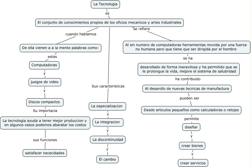 Este Cmap, tiene información relacionada con: tecnologia octavo c, Computadoras y juegos de video, La Tecnologia es El conjunto de conocimientos propios de los oficios mecanicos y artes industriales, juegos de video y Discos compactos, diseñar y crear bienes, Discos compactos Su importacia La tecnologia ayuda a tener mejor produccion y en algunos casos podemos abaratar los costos, La tecnologia ayuda a tener mejor produccion y en algunos casos podemos abaratar los costos sus funciones satisfacer nececidades, Al sin numero de computadoras herramientas movida por una fuerza no humana pero que tiene que ser dirigida por el hombre se ha desarollado de forma maravilosa y ha permitido que se le prolongue la vida, mejore el sistema de salubridad, La especializacion y La integracion, La discontinuidad y El cambio, La integracion y La discontinuidad, Desde articulos pequeños como calculadoras o relojes perimite diseñar, Al desarollo de nuevas tecnicas de manufactura pueden ser Desde articulos pequeños como calculadoras o relojes, desarollado de forma maravilosa y ha permitido que se le prolongue la vida, mejore el sistema de salubridad ha contribuido Al desarollo de nuevas tecnicas de manufactura, El conjunto de conocimientos propios de los oficios mecanicos y artes industriales Sus caracteristicas La especializacion, De ella vienen a a la mente palabras como: estas Computadoras, crear bienes y crear servicios, El conjunto de conocimientos propios de los oficios mecanicos y artes industriales se refiere ????, El conjunto de conocimientos propios de los oficios mecanicos y artes industriales cuando hablamos ????