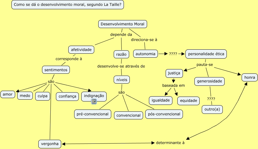 Este Cmap, tiene información relacionada con: Desenvolvimento Moral, Desenvolvimento Moral depende da afetividade, autonomia ???? personalidade ética, justiça baseada em equidade, níveis são pós-convencional, afetividade corresponde à sentimentos, honra determinante à vergonha, sentimentos são indignação, personalidade ética pauta-se justiça, níveis são pré-convencional, generosidade ???? outro(a), personalidade ética pauta-se honra, sentimentos são vergonha, sentimentos são medo, razão desenvolve-se através de níveis, personalidade ética pauta-se generosidade, níveis são convencional, Desenvolvimento Moral direciona-se à autonomia, Desenvolvimento Moral depende da razão, sentimentos são culpa, justiça baseada em igualdade