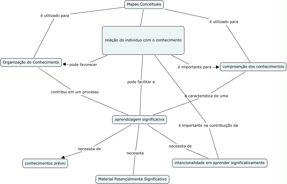 Este Cmap, tiene información relacionada con: mapa JP, aprendizagem significativa necessita Material Potencialmente Significativo, relação do individuo com o conhecimento pode facilitar a aprendizagem significativa, aprendizagem significativa necessita de intencionalidade em aprender significativamente, Mapas Conceituais é utilizado para compreenção dos conhecimentos, compreenção dos conhecimentos é caracteristica de uma aprendizagem significativa, Organização do Conhecimento contribui em um processo aprendizagem significativa, Mapas Conceituais é utilizado para Organização do Conhecimento, relação do individuo com o conhecimento é importante para compreenção dos conhecimentos, Mapas Conceituais proporciona uma relação do individuo com o conhecimento, relação do individuo com o conhecimento pode favorecer Organização do Conhecimento, relação do individuo com o conhecimento é importante na contribuição da intencionalidade em aprender significativamente, aprendizagem significativa necessita de conhecimentos prévio